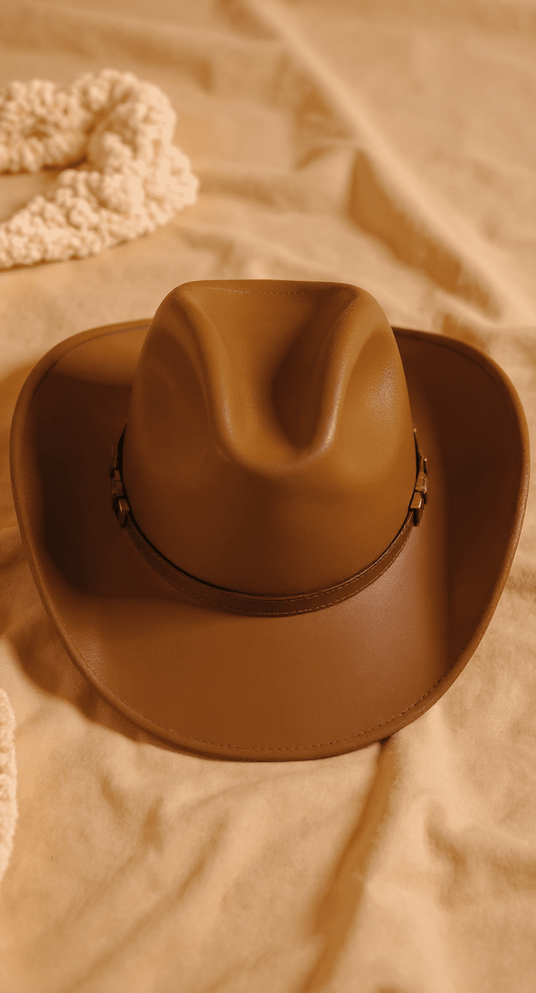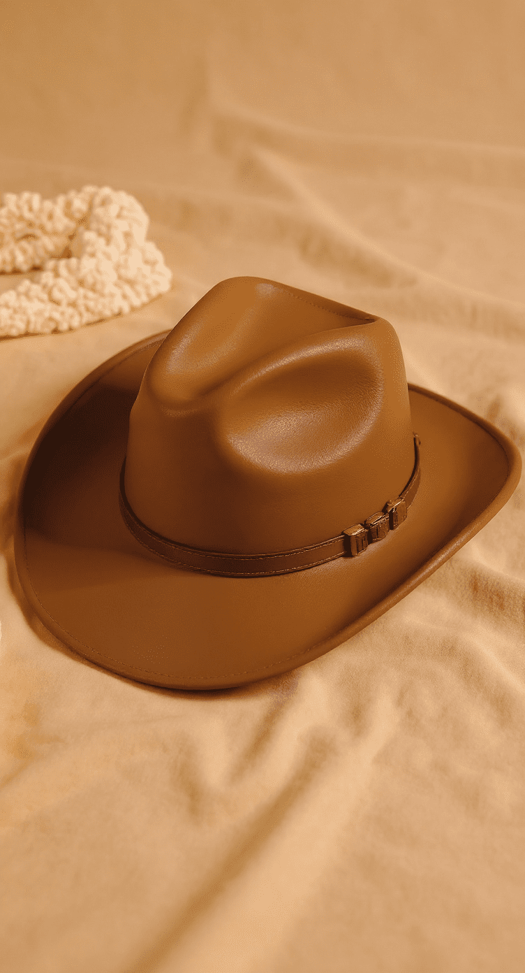 Crafted from high-quality, smooth cognac-colored leather, this western-style cowboy hat offers a blend of tradition and modern sophistication. It features the classic pinched crown and a wide brim for sun protection. The hat is accented with a two-tone hatband, a dark brown leather base complemented by brass-tone metal detailing, adding a touch of vintage flair. The rich, warm tone of the leather makes it a versatile accessory for festivals, horseback riding, or as a stylish statement piece.